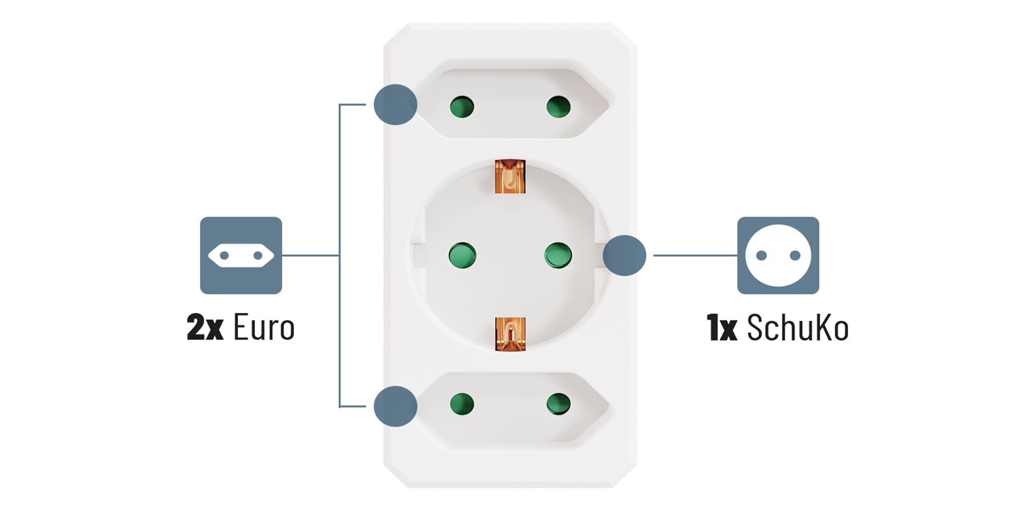 - ERMÖGLICHT gleichzeitiges Anschließen von zwei Eurostecker und einem Schutzkontaktstecker