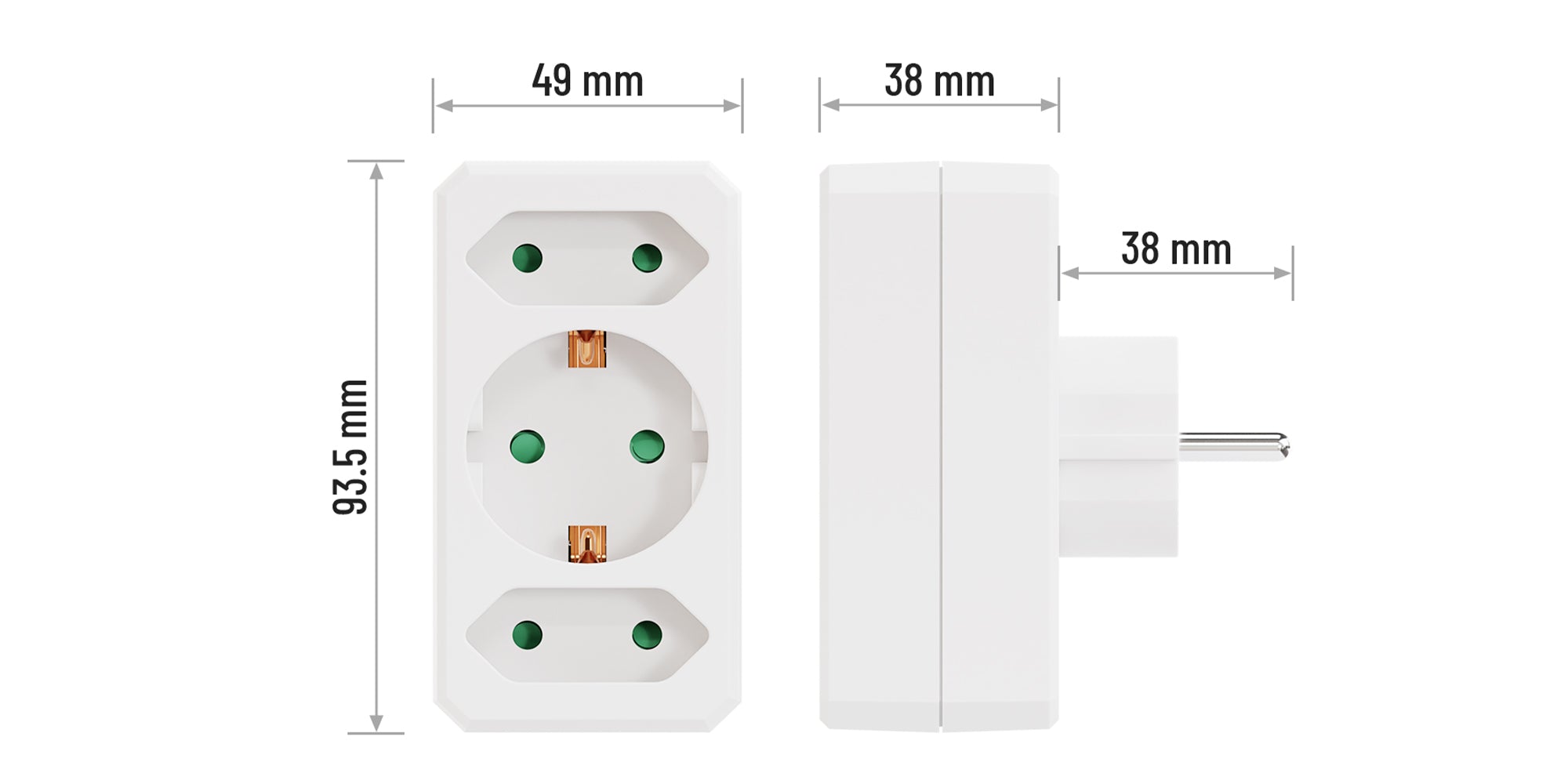 - LIEFERUNG enthält 3er Steckdosenadapter / weiß / für Innenräume / Betriebsspannung 250V AC 6A max. 3500W / Abmessungen 93,5 x 49 x 38 mm