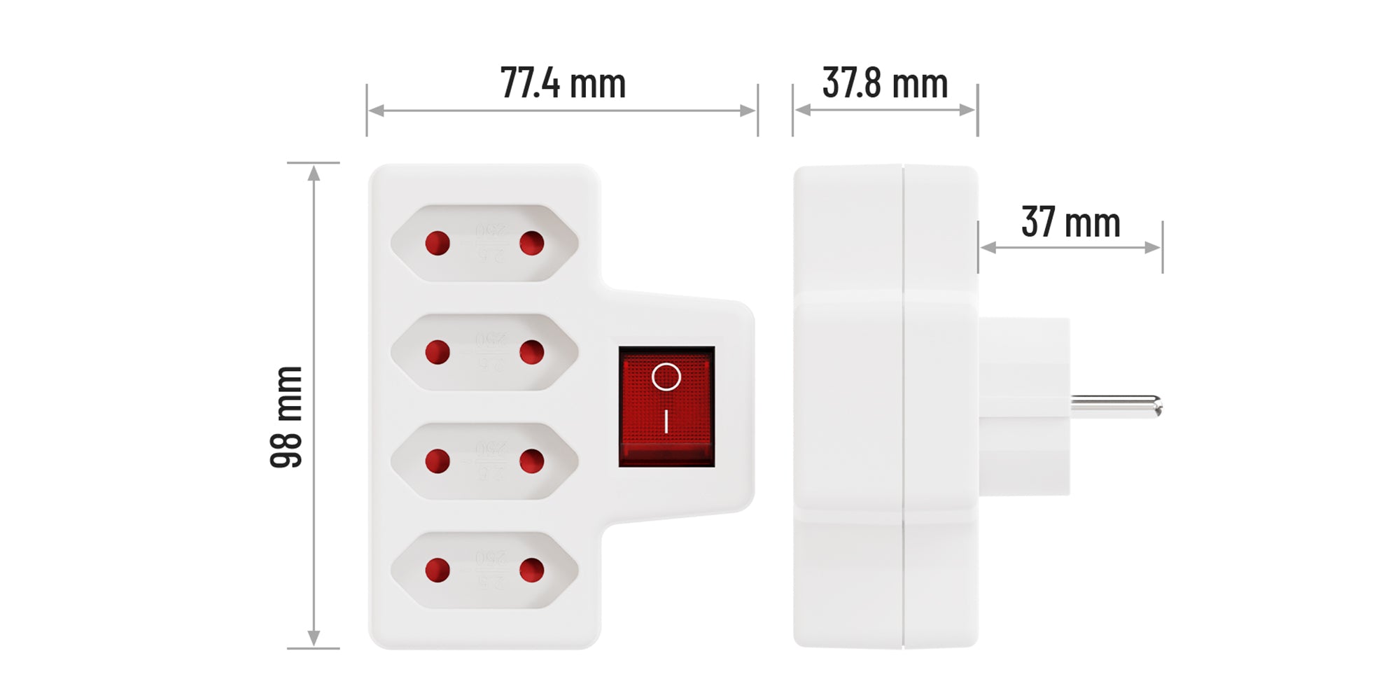 - LIEFERUNG enthält 1x Mehrfachsteckdose ohne Kabel 4fach / weiß / für Innenräume / Betriebsspannung 230V AC 2,5A max. 2300W / Abmessungen 98 x 77,4 x 74,8 mm
